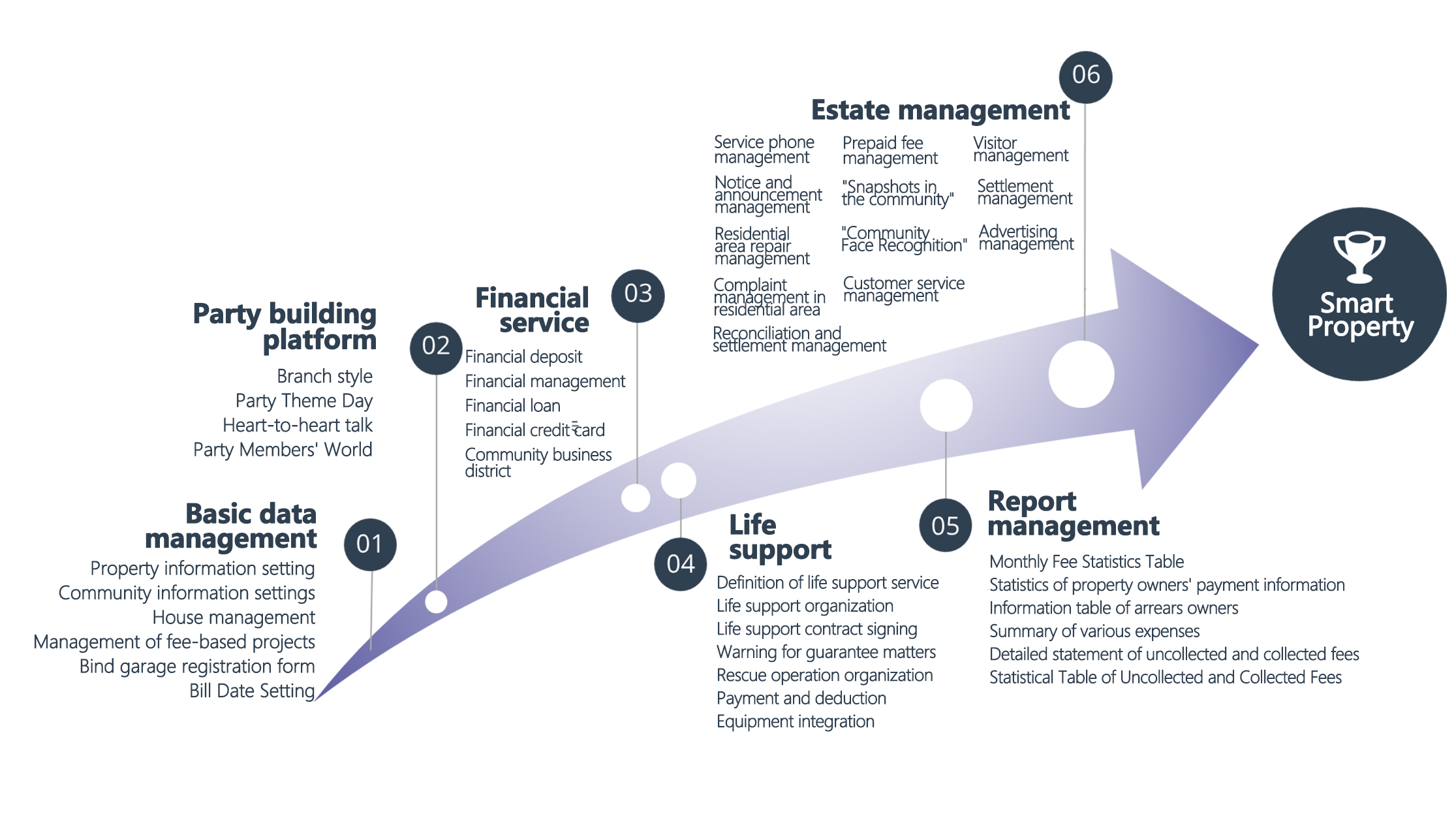 property management services, intelligent data processing, data analysis to assist decision-making, community ecological construction, party building platform, convenient financial services.