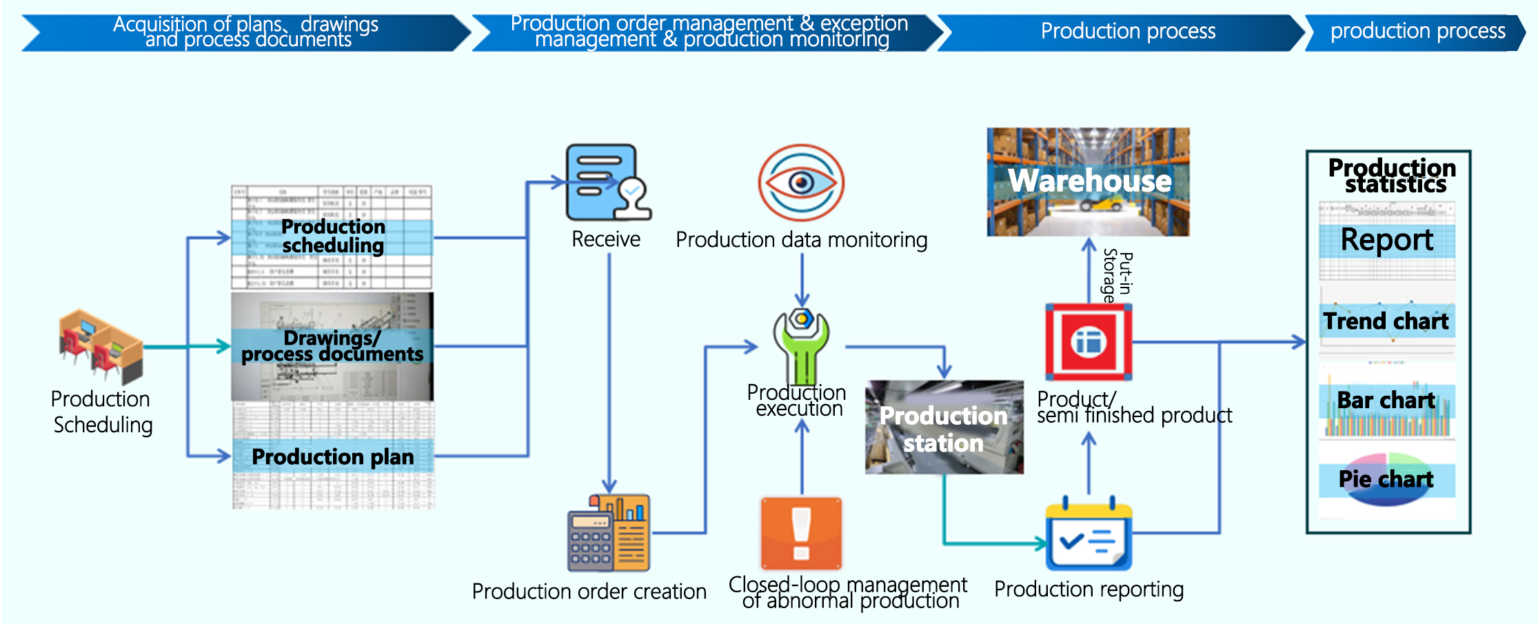 Take the production work order as the core, use information technology to manage the production process of the whole factory, and clarify the production situation of each production line and station;