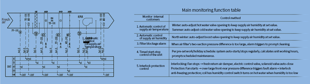 This product is independently designed and developed by our company. It is mainly composed of the main controller, expansion module, display, control and storage unit, and is programmed by software to realize the control of the fresh air unit.