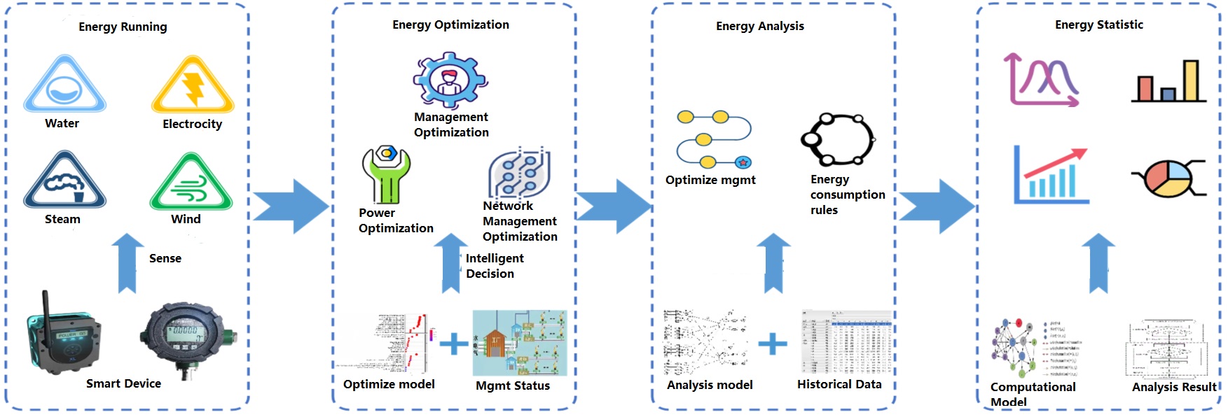 can grasp the operation of the energy pipe network, key energy-using equipment, processes and procedures in real time; establish an energy optimization calculation model, further explore the law of energy operation, and provide the company with intelligent decision-making for energy optimization from the two aspects of pipe network and electricity, and give suggestions for energy consumption optimization; use the energy analysis model to make regular, thematic and comprehensive analysis of energy, and comprehensive analysis of the advantages and disadvantages of energy management and energy consumption optimization results; the use of energy statistical calculation model, in a variety of ways to complete the energy network and key energy equipment, process energy consumption data visualization, to help enterprises improve the level of energy management, enhance energy optimization capabilities, the establishment of energy evaluation system, reduce energy operating costs.