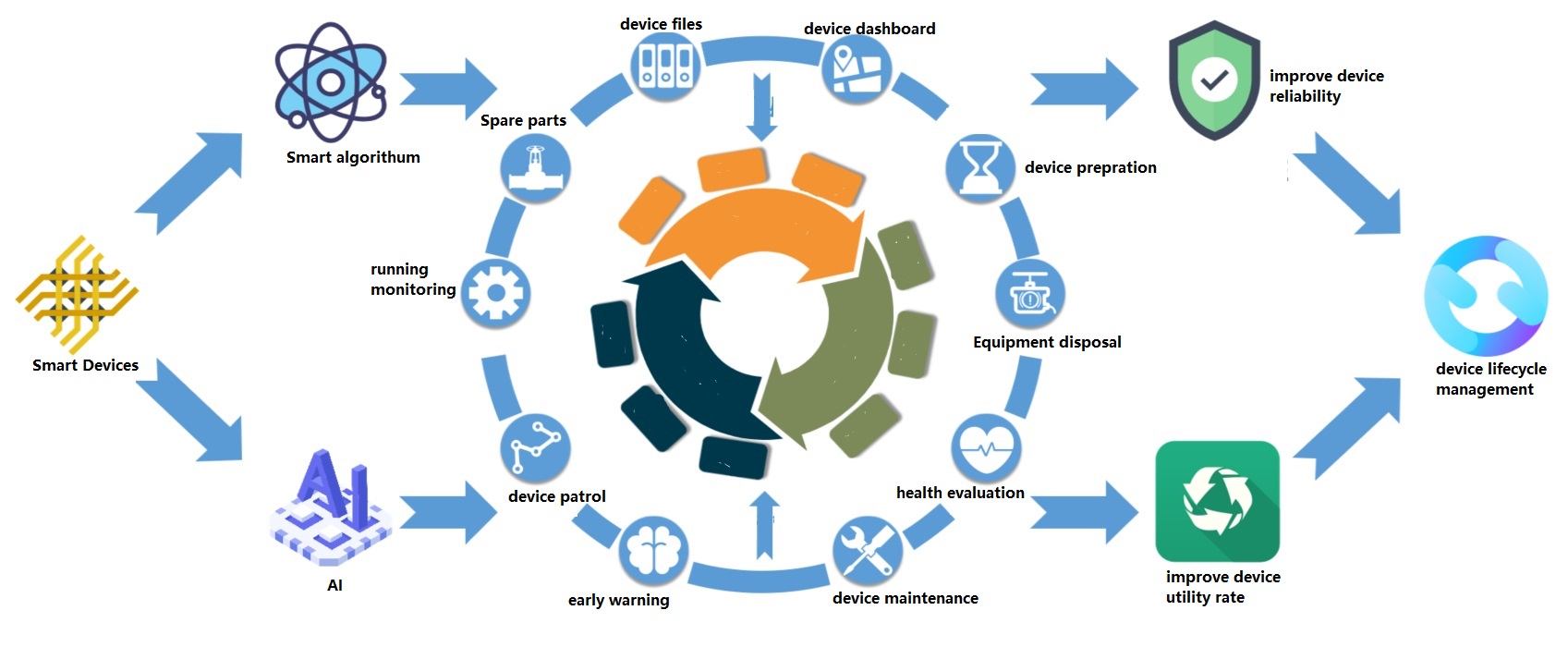 completes the comprehensive perception monitoring of equipment and the closed-loop management analysis of the whole process of equipment preparation, operation and disposal through the deep integration of the intelligent prediction calculation model of the equipment and the intelligent AI. Help enterprises to use intelligent means to subvert the traditional equipment management methods, reduce equipment failure rate, reduce equipment cost, improve equipment reliability, improve equipment comprehensive utilization rate, and realize equipment life cycle management.